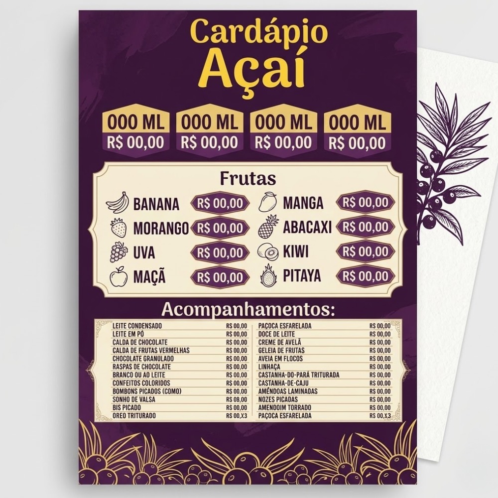 Opção 2 Lados (Frente e Verso): Maximize o espaço para fotos, descrições e combos, aproveitando os dois lados da peça.