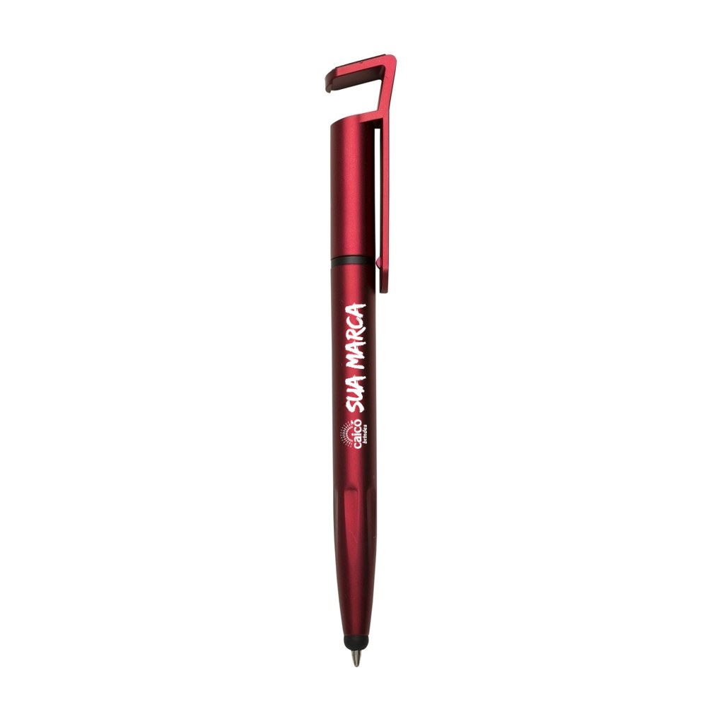 Dica do Especialista: O suporte para celular é o "uau" deste produto. Quando o cliente percebe que a caneta segura o aparelho dele para ver um vídeo, o valor percebido do brinde sobe na hora!