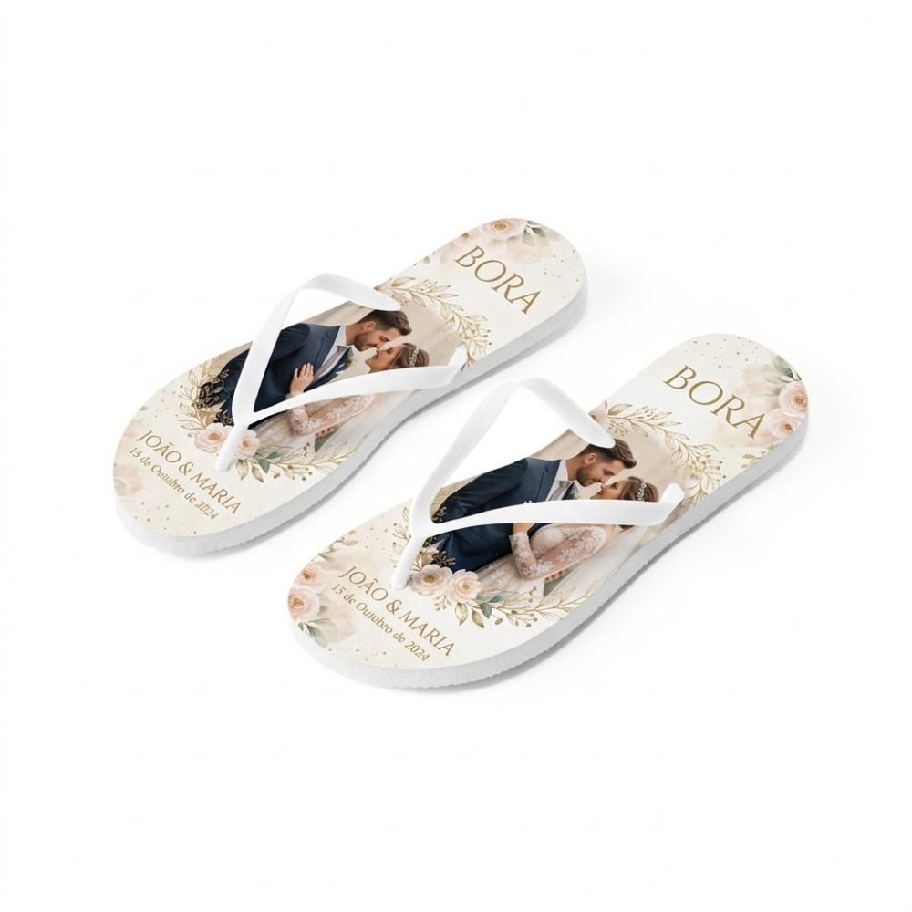 Praticidade na Entrega: Para pedidos personalizados, enviamos os chinelos já montados e prontos para uso em um saco protetor.
